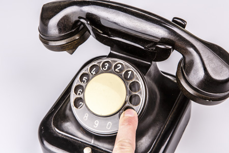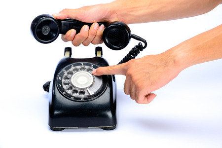 Close up view, hand finger on rotary dial of black vintage phone, isolated on white .