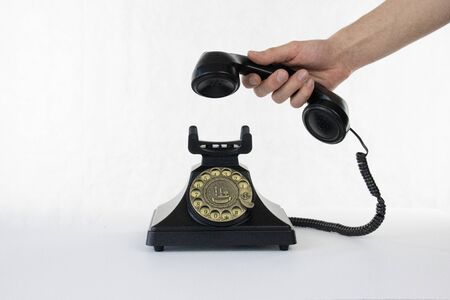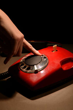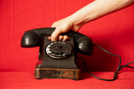 Old retro phone black and woman's hand closeup, call on the phone, technology