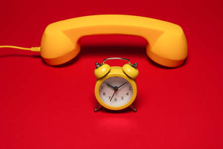 Top view of a male finger dialing a telephone number using black landline phone. Over yellow background.