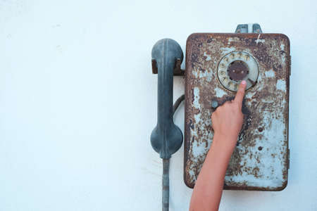 an old and rusty telephone hangs on the wall, the child is reaching out.