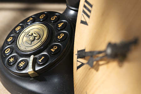 A elegant woman's hand next to an old vintage 70's and 80's style rotary telephone receiver on a wooden background, retro office phone call concept