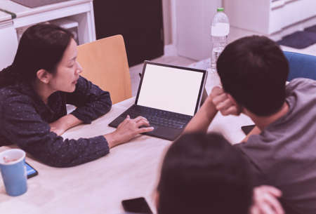 Group of people teamwork working on laptop late at night.