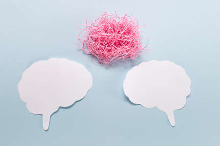 Mind brain communication thinking argument concept with two paper brains and pink cloud on blue background.