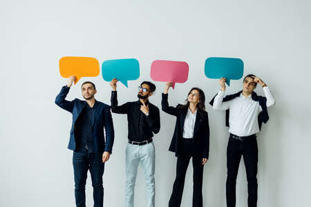 Portrait of a group of multiracial business people holding empty speech bubbles isolated over white background