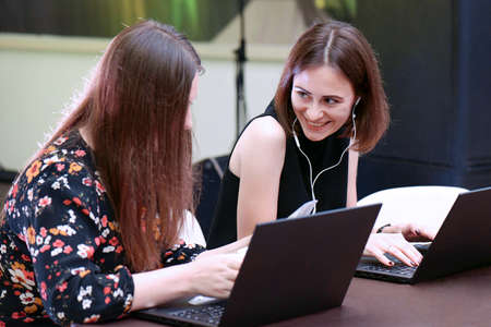 Happy women or friends students with laptop in office.Professional female discussing business issues.Business, education, startup and people concept/Two happy business woman working together