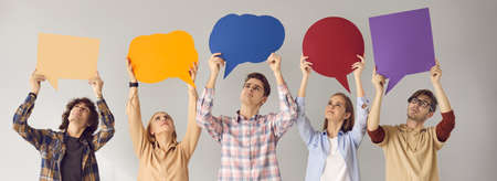 Group of young people standing on gray studio background, looking up at multicolored empty cardboard and paper mockup speech bubbles, giving feedback, sharing important message, expressing own opinion