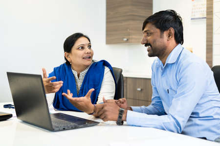 Happy young biracial businesswoman interacting with male colleague at working meeting in openspace office
