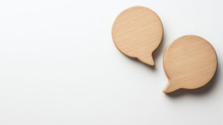 Two wooden speech bubble shapes placed on a clean white background, representing conversation, communication, and dialogue in a modern, minimalistic style.