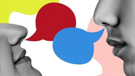 Conceptual graphic design. Two faces in close dialogue, large red and blue speech bubbles overlapping, surrounded by colorful abstract elements, symbolizing exchange. Concept of communication.