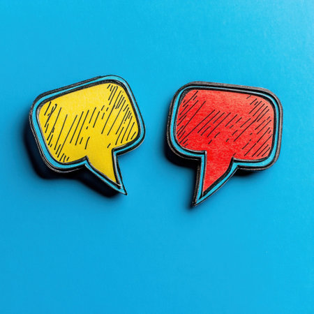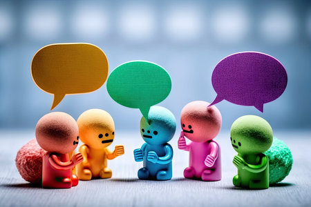 Two colorful speech bubbles represent dialogue and interaction against a bright blue backdrop.