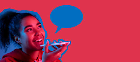 Contemporary art collage, modern design. Retro style. Recording voice on red studio background in magazine style