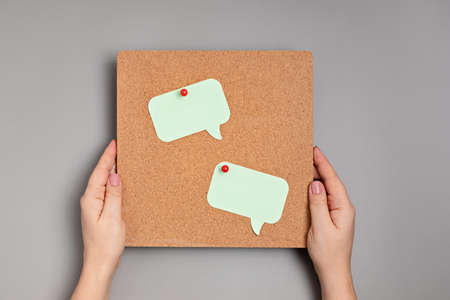 Person hand holding blank bubbles speech paper in colorful background.for ecoration text.real photo