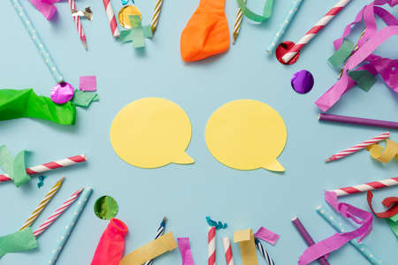 Blue paper speech bubbles on yellow background. Top view
