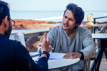 two happy businessmen discussing freelancer strategy in a meeting, Indian business man remote work freelancing sitting in a summer restaurant by the sea.successful deal on the beach tropical island