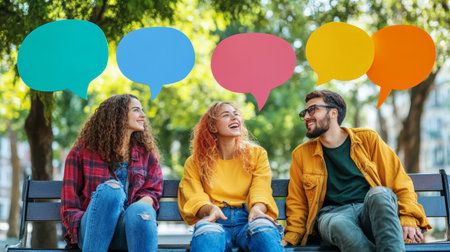 Three young students are sitting on a bench in a park, talking and sharing ideas, with colorful speech bubbles above their heads representing their thoughts and conversations