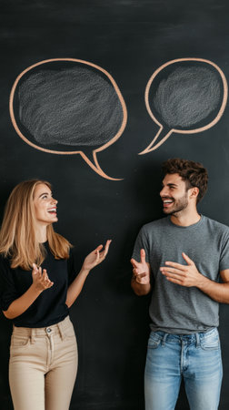 Two young professionals discussing and exchanging ideas near speech bubbles on a blackboard, representing communication and collaborative teamwork in a creative setting