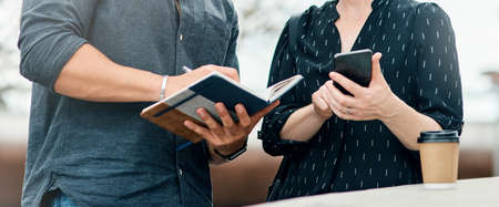 You dont always get what you wish for, you get what you work for. two unrecognisable students looking at a notebook and using a mobile phone outside on campus.
