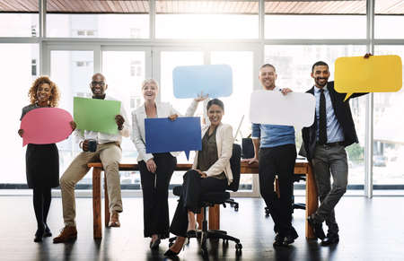 Making our opinions known. Portrait of a group of businesspeople holding speech bubbles in an office.