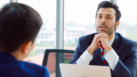 Job seeker in job interview meeting with manager and interviewer at corporate office. The young interviewee seeking for a professional career job opportunity . Human resources and recruitment concept.