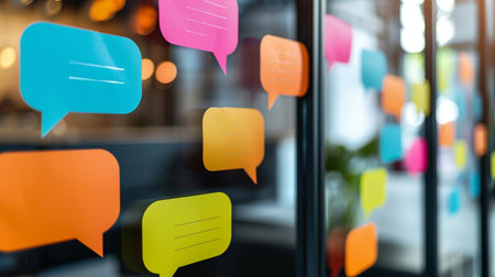Assorted colorful speech bubble sticky notes arranged on a glass surface, symbolizing communication and ideas.