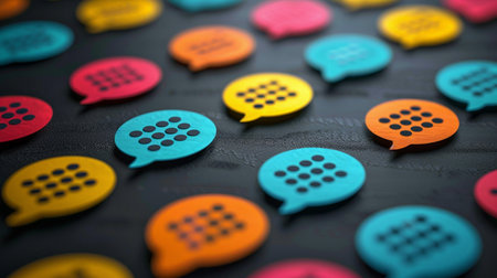 Collection of brightly colored chat bubbles with embossed dot patterns, representing communication and connection. Ideal for digital concepts.