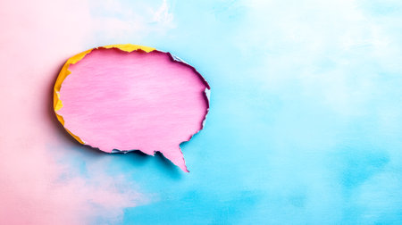 Pink speech bubble with torn edges on a blue and pink pastel background