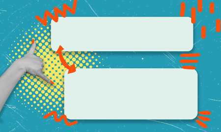 Trendy poster with hand in halftone style on the topic of sending messages. Conduct correspondence, give comment, place an ad concept. Horizontal banner, vector graphics