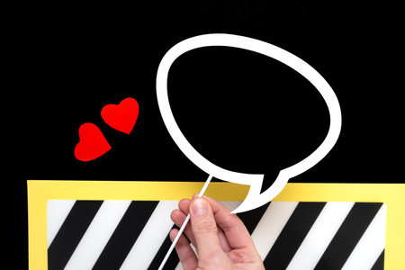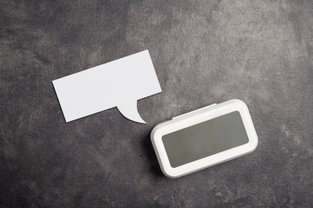 Empty paper with speech symbol and clock on black background. Empty area for copy space