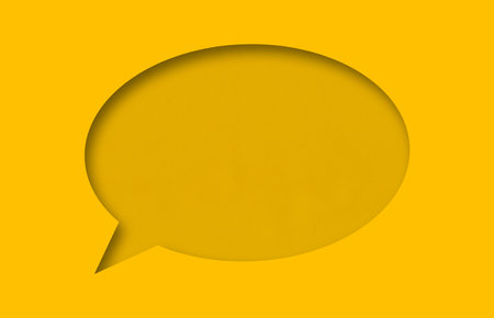 Yellow paper cut into holes speech bubble shape are overlaid with light and shadow and have copy space.