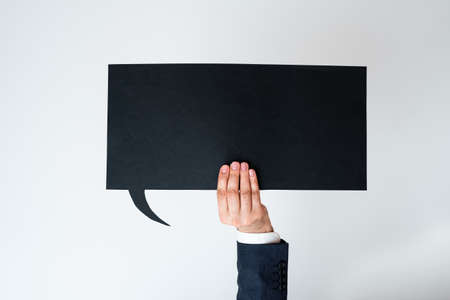 Male hands holding speech bubble on grey background