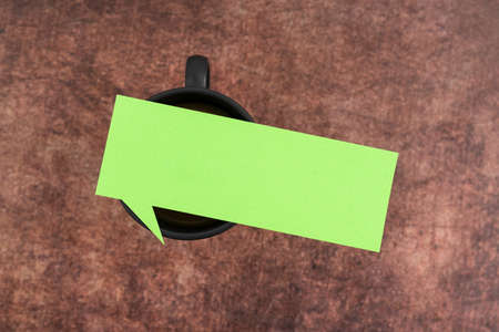 Pastel Color Thought Bubble Paper On Cup Of Coffee Over Wooden Background. Empty Sheet Placed Above Mug Drink Displaying Business Advertisement And Brand Promotion.