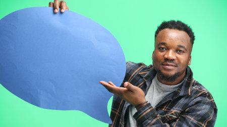 A man, close-up, on a green background, shows a blue comment sign