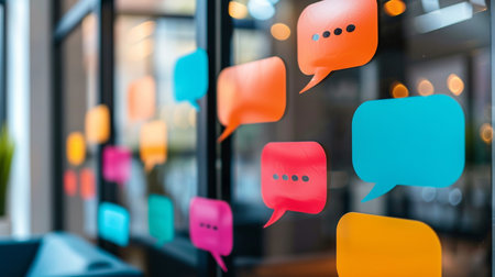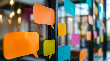 Brightly colored speech bubble sticky notes are creatively displayed on a glass partition in a contemporary office space, blurred background.