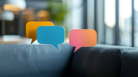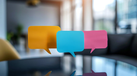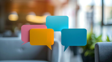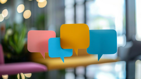 Three colorful speech bubbles, pink, orange, and blue, overlap in a modern office setting with a soft, out-of-focus background.