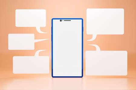 Cell phone with blank LCD screen and chatbox around a smartphone on orange background. Concepts of communication using modern technology through the use of online social forms. Realistic 3D rendering.