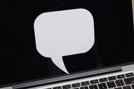Speech bubble made of paper on an open laptop screen. Part of the keyboard is visible.