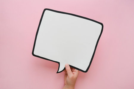 Human hand holding blank blue text message bubble. Young female showing rectangular paper mockup speech balloon. Cropped close up studio shot on blue background. Anonymous opinion concept