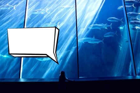 Speech bubble against little girl looking at fish tank