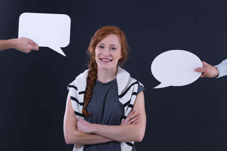 Pretty smiling young woman and two empty speech bubbles next to her