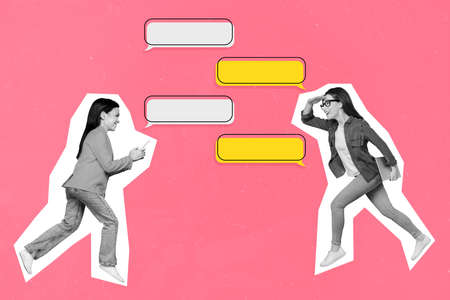 Collage image of pinup pop retro sketch of two ladies chatting dialog clouds empty space isolated pink color background