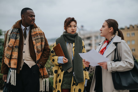 Diverse group of business people having a serious outdoor discussion