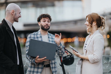 Young businesspeople meeting outdoors discussing a project in the city on a sunny day