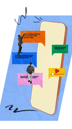 Team communicating online via text message on mobile phone. Digital communication and innovation. Contemporary art collage.