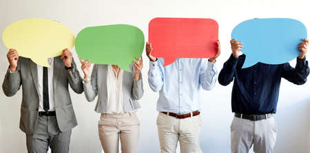Put a face to the voice. a group of businesspeople holding speech bubbles in an office at work.