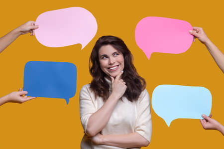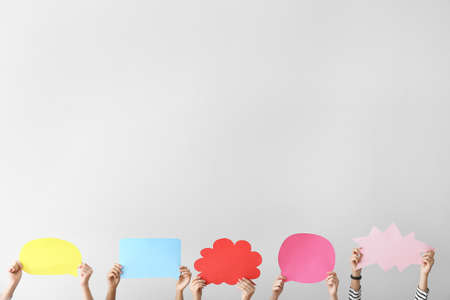 Group of young people standing on gray studio background, looking up at multicolored empty cardboard and paper mockup speech bubbles, giving feedback, sharing important message, expressing own opinion