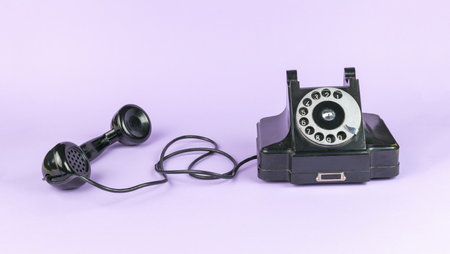 Black vintage handset with the handset off on a purple background. The old technique.