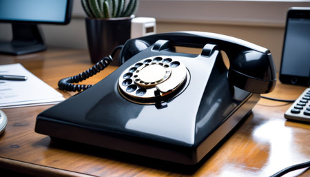 A classic black rotary telephone placed on a polished wooden desk, evoking a retro feel in a modern setting.. AI Generation