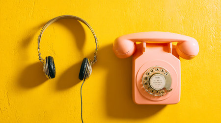 Retro style creative flat lay. Rotary vintage telephone with classic white earphones on yellow background. Pop culture. Top view