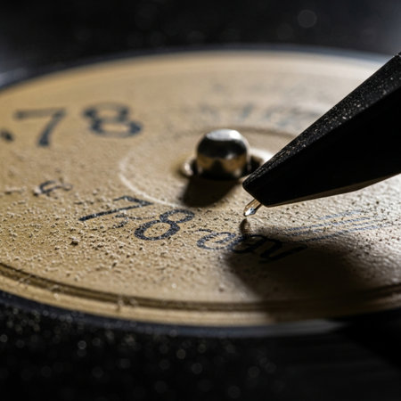 A detailed close-up of the surface of a black vinyl record, showing a mesmerizing rainbow-like iridescence reflecting off the fine grooves. The shallow depth of field focuses on the center, highlighting the delicate texture and nostalgic beauty of analog music.