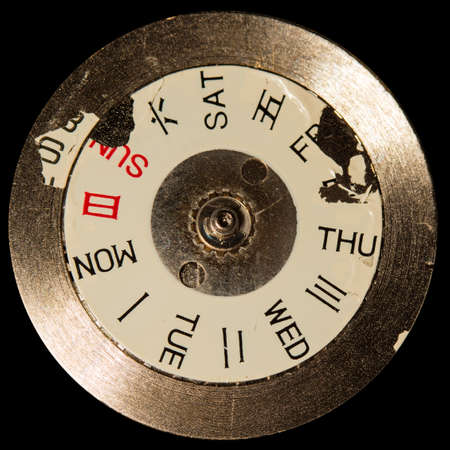 Dial of old photo flash exposure meter with aperture stops, iso numbers and distance marks. Retro photography background